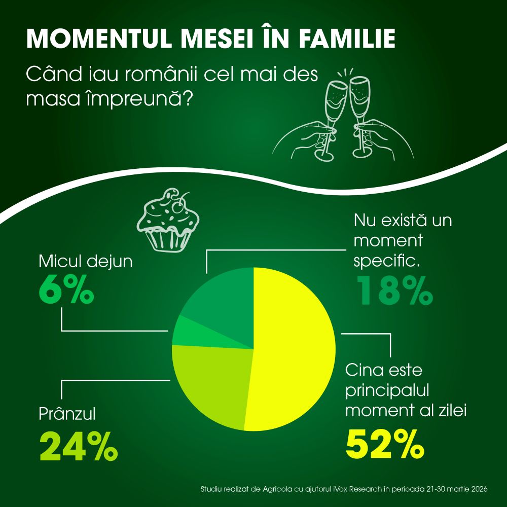 *Studiul „Mesele în familie la români” a fost realizat cu ajutorul platformei iVox Research, în perioada 20-31 martie 2026, pe un eșantion de 1.121 de respondenți adulți din România.