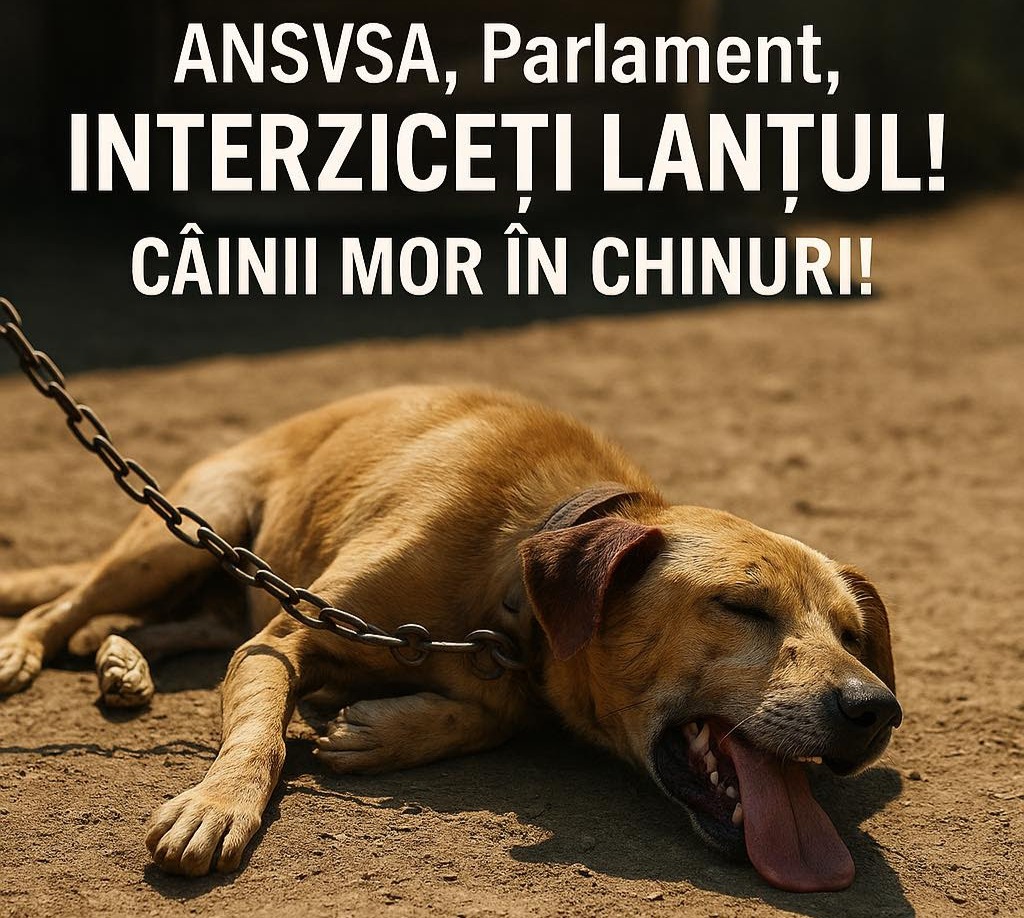 Interziceți lanțul, eliberați animalele! Lupta animalelor pentru supraviețuire este pe stradă, nu acasă! Temperaturi de peste 30 de grade sunt letale pentru animale fără posibilitate de mișcare, hidratare și umbră.
