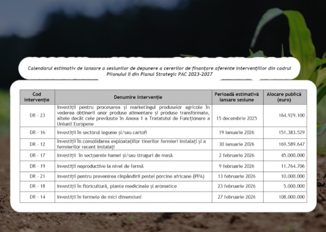 Potrivit calendarului publicat, începând cu decembrie 2025 – februarie 2026 vor fi deschise sesiuni de finanțare pentru principalele intervenții dedicate investițiilor în agricultură și procesare, printre care: