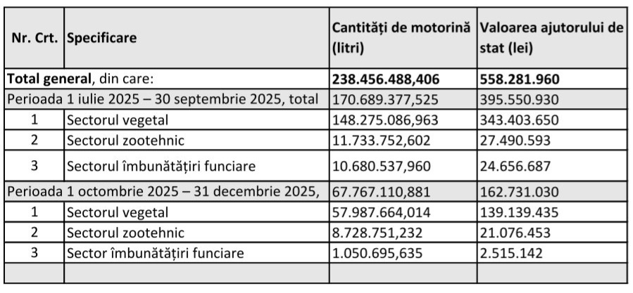 – 395.550.930 lei – trimestrul III 2025 – pentru un număr total de 17.259 beneficiari cu o cantitate de 170.689.377,525 litri motorină;