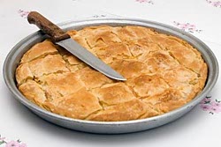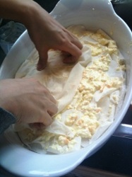 Ungeti cu ulei un vas de cuptor de marime medie. Acoperiti fundul vasului cu doua foi de placinta, stropiti cu apa carbogazoasa, apoi cu unt topit si apoi cu amestecul de oua si branza faramitata.